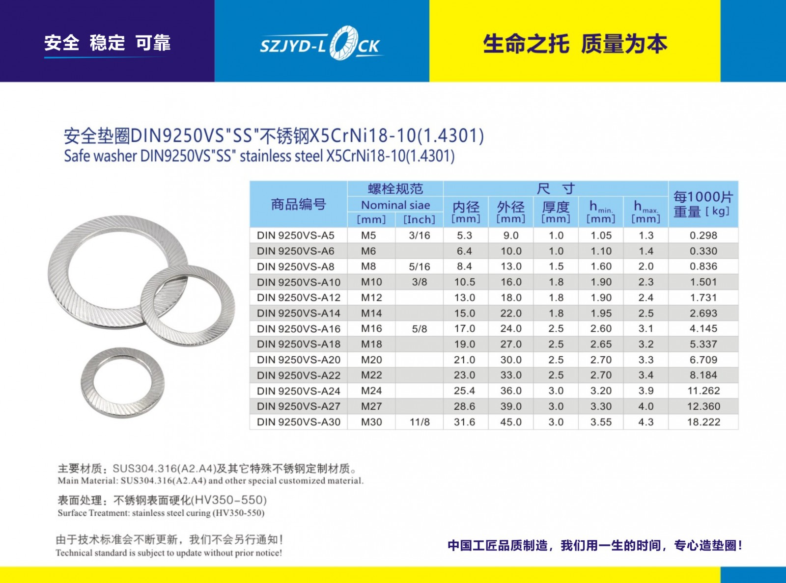 VS不銹鋼防松墊圈、執(zhí)行DIN9250德國標(biāo)準(zhǔn)、按螺栓的使用條件分為兩類:S表示輕防松墊圈、VS表示重型安全墊圈系列、