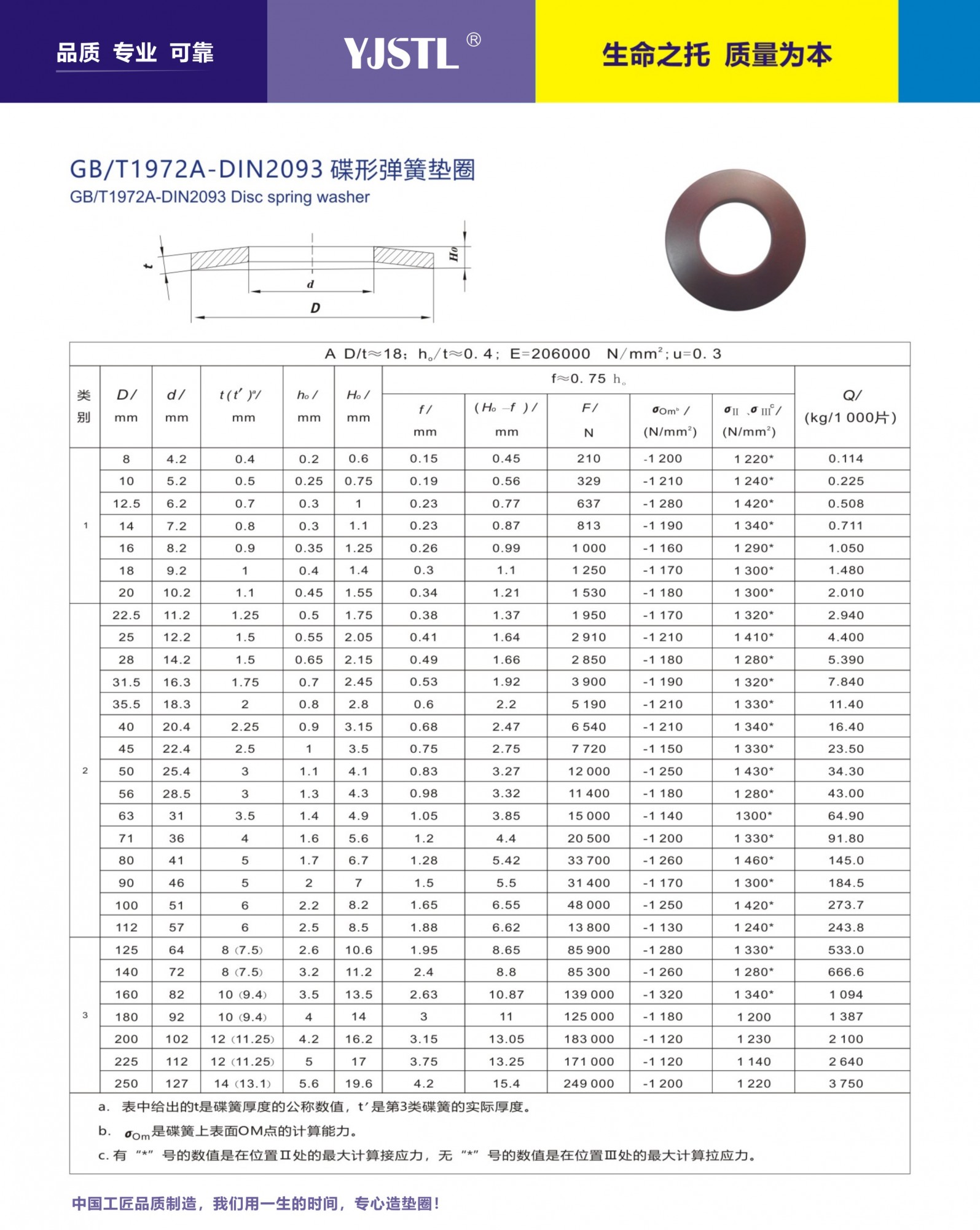 制造執(zhí)行標(biāo)準(zhǔn):國標(biāo)GB1972ABC引用DIN2093(ABC系)。規(guī)格:M-M127 也能根據(jù)客戶需求提供訂制,主要材質(zhì)有65MN,60Si2mn,51crav4及特殊合金材質(zhì),鹽浴硬化,表面處理為磷化黑,機(jī)械鋅,達(dá)克羅涂層等!不提供化學(xué)電鍍處理!多數(shù)情況下標(biāo)準(zhǔn)型碟形彈簧墊圈并不能完全滿足用戶要求,通過計(jì)算與適當(dāng)調(diào)整來獲得理想的訂制功能!