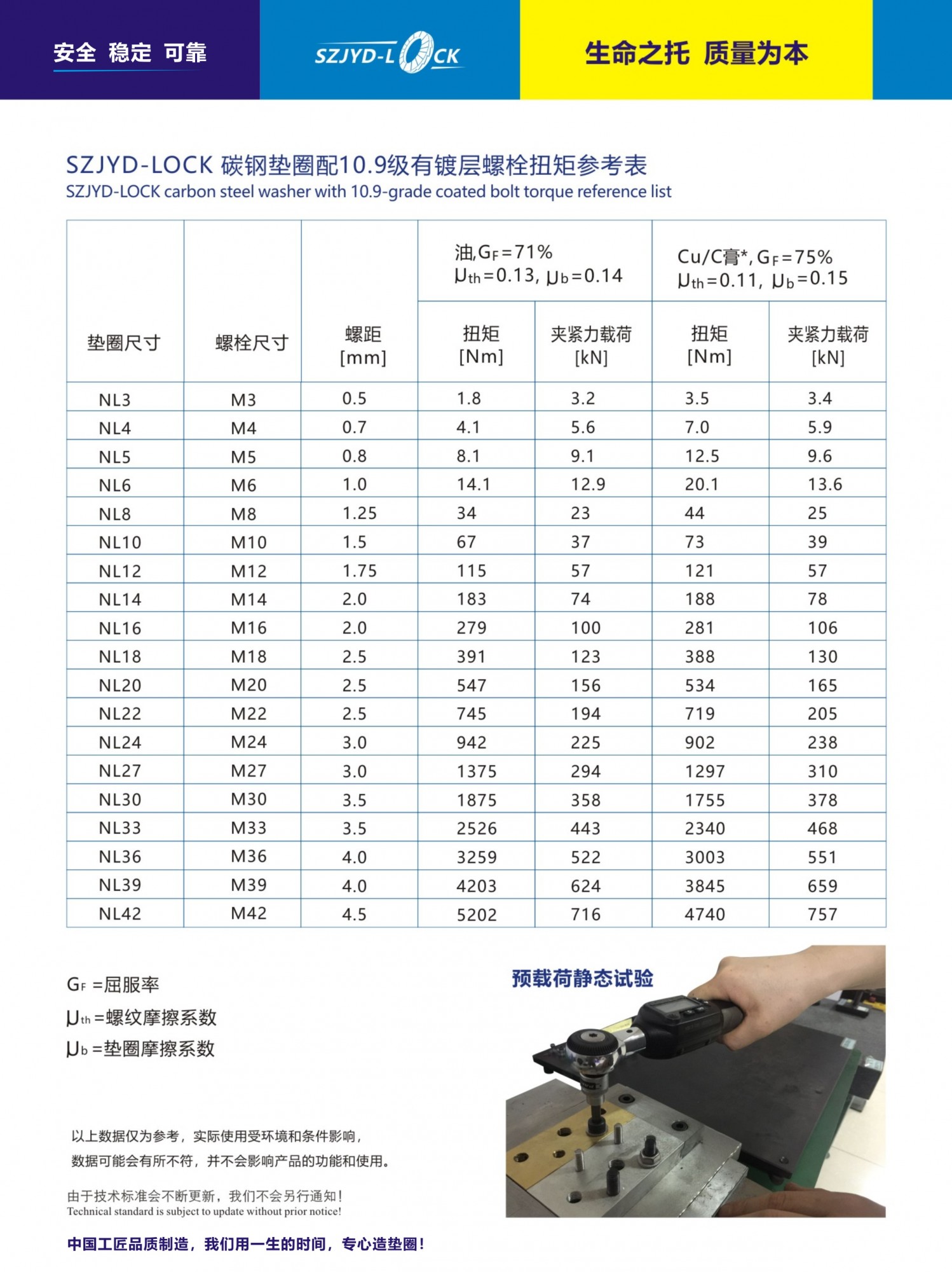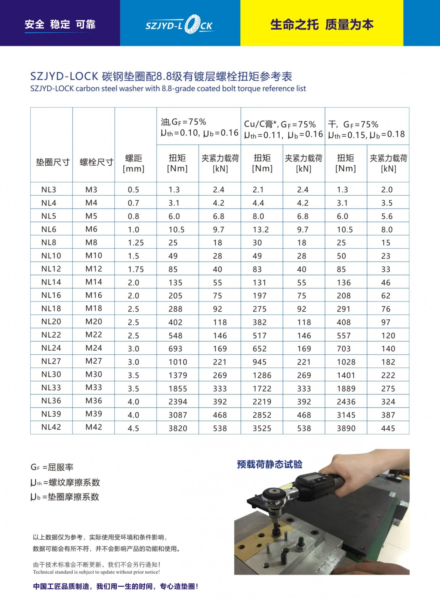 雙疊自鎖墊圈的使用:墊圈兩個(gè)大斜齒面成對粘合,目的是便於安裝和防止錯(cuò)誤使用!墊圈的硬度必須高于螺栓的硬度!SZJYD-LOCK墊圈全部經(jīng)過DIN65151橫向振動測試可以達(dá)到200萬測試、其衰減率不低于70%!