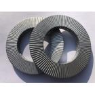 獨(dú)特的墊圈的內(nèi)側(cè)斜齒面傾斜角度 α 大于螺栓螺紋傾斜角度 β 。 裝配時(shí), 內(nèi)側(cè)斜齒面是相對的, 墊圈外側(cè)放射狀的凸紋面 (外滾花齒面) 的摩擦系數(shù)要比內(nèi)側(cè)斜齒面 的摩擦系數(shù)大, 且與兩端接觸面成咬合狀態(tài)。 當(dāng)連接件受到振動, 并使螺栓發(fā)生松動趨勢時(shí), 僅僅允許兩片墊圈內(nèi)側(cè)斜齒間相對抬升錯(cuò)動, 產(chǎn)生擡升張力。 獨(dú)特的齒牙系統(tǒng)利用張力在緊固的 連接處產(chǎn)生壹個(gè)很高的抵抗力來經(jīng)受振動力,從而達(dá)到 100% 的防松效果。