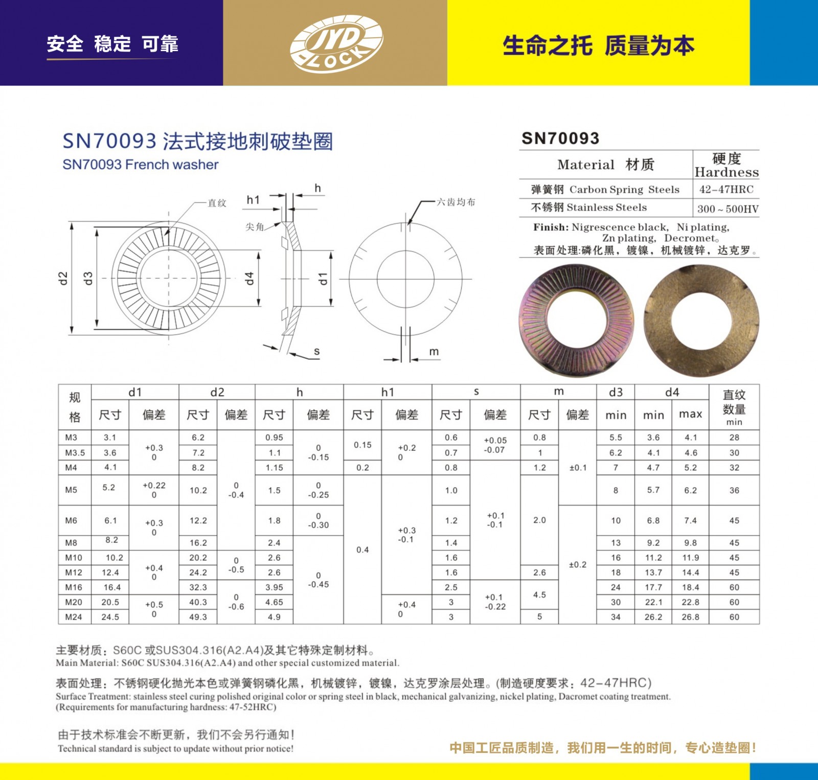 SN70093是德國(guó)西門子公司的企業(yè)標(biāo)準(zhǔn)、該墊圈是一款法式鎖緊墊圈的改良設(shè)計(jì)產(chǎn)品、表面條紋有預(yù)緊防松作用。墊圈的背面設(shè)計(jì)有六個(gè)爪形剌破角!主要功能是在配合螺栓螺釘擰緊時(shí)可以剌破金屬基體表面!主要功能是剌破作用、因此也有人叫剌破墊圈、帶爪觸地墊圈!