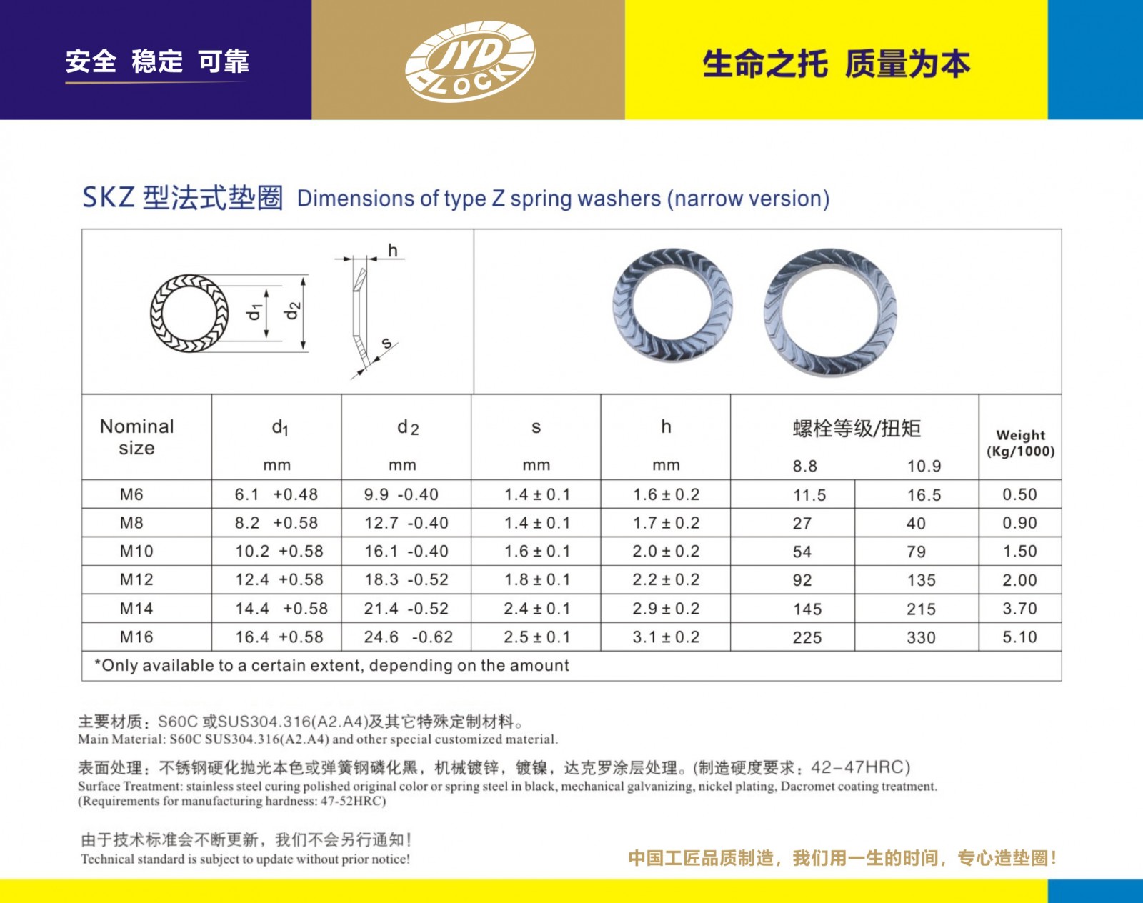 執(zhí)行制造標(biāo)準(zhǔn):SKZ鎖緊墊圈規(guī)格:M6-M16為標(biāo)準(zhǔn)型號(hào) ,根據(jù)客戶需求可提供訂制 主要鋼質(zhì):SUS304.316、A2.A4及超級(jí)不銹鋼等 硬化等級(jí):HV350 符合10級(jí)強(qiáng)度。硬化拋光表面處理, 經(jīng)有效測(cè)試800小時(shí)以上 完全符合歐盟ROHS標(biāo)準(zhǔn)、