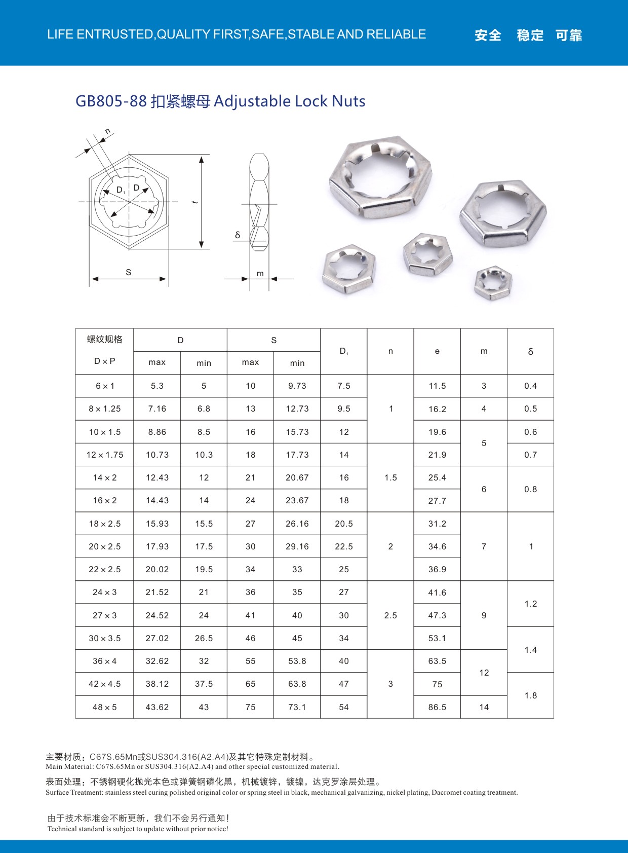 國標(biāo)GB805扣緊螺母,使用65MN彈簧鋼材質(zhì),全硬化鍍鋅除氫處理,常規(guī)品M4-M48現(xiàn)貨齊全!歡迎索樣咨詢!