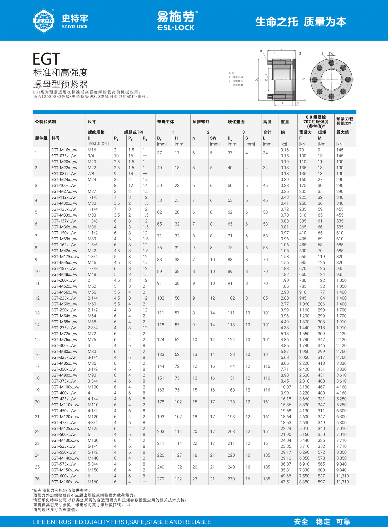 多頂推超級預(yù)緊器,可在很小空間安裝,使用簡單工具即可輕松預(yù)緊,節(jié)省安裝時間,ESL-LOCK品牌易施勞超級螺母具有完全的防松鎖緊功能,可多次拆卸重復(fù)使用。特別適用于M24規(guī)格以上大型螺栓鎖緊!一擰永固,永不松動!使用常規(guī)格為合金材料及特殊不銹鋼合金材料以及鎳基合金材料!更多了解歡迎咨詢我們.....